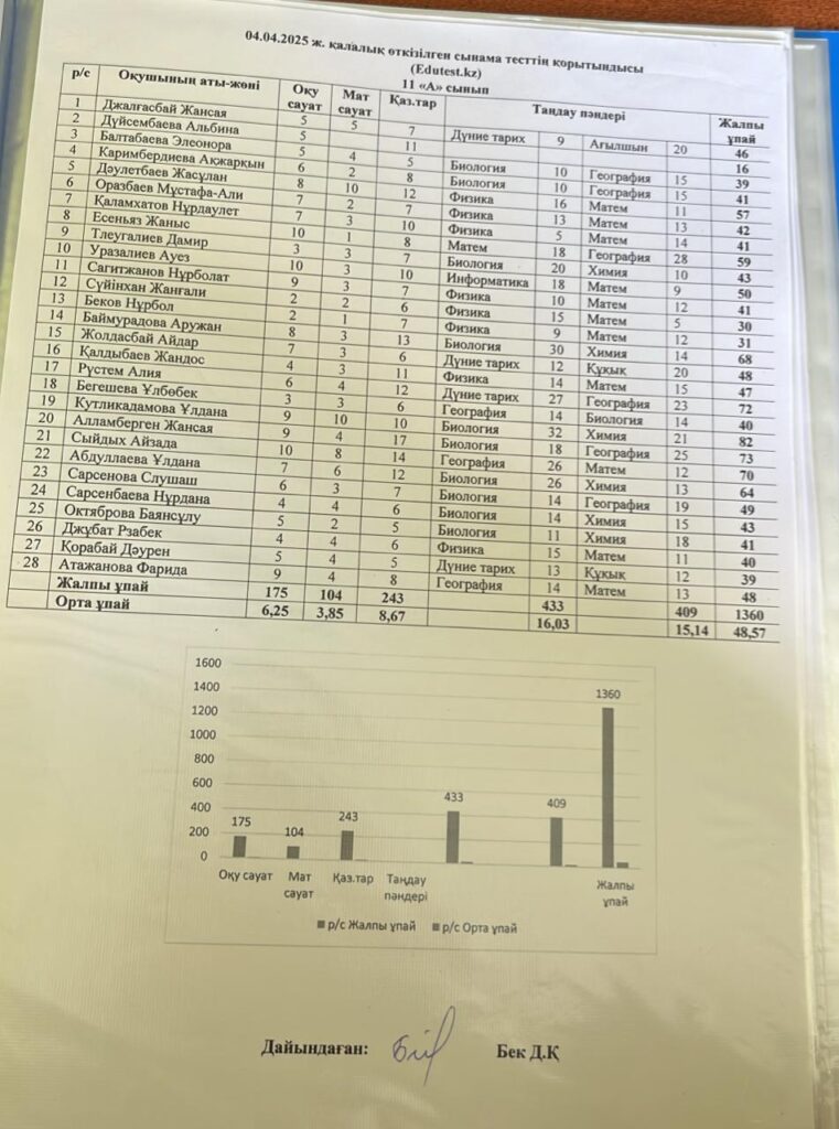 04.04.2025ж. қалалық сынама тест нәтижесі4 апреля, 20254 июня, 2025 04 сәуір күні «Edutest.kz» сайты арқылы өткізілген сынама тест қорытындысы Добавить комментарий Отменить ответВаш адрес email не будет опубликован. Обязательные поля помечены *Имя * Email * Сайт Комментарий * Сохранить моё имя, email и адрес сайта в этом браузере для последующих моих комментариев.