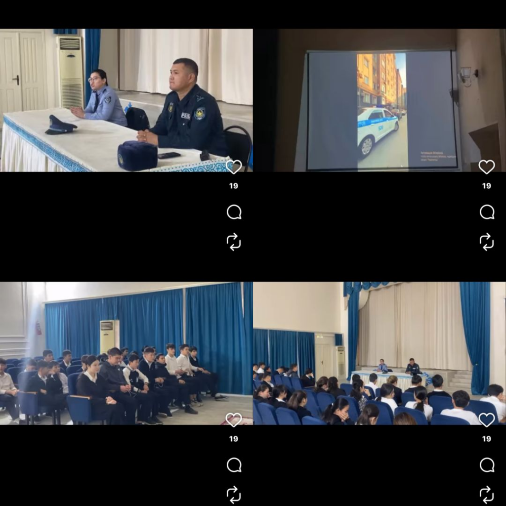 26.11.2025 ж.Мектебімізде мектеп әкімшілігі, Ақтау қаласы ПБ ҚҚб ОТЗЗҚКб бастығы полиция майоры К.Кылишаева; ПБ ҚҚ6 ЮПБ УПИ полиция капитаны Ө.Жусипбеков 8,10 сынып білім алушыларына : 1.«Гендерлік зорлық-зомбылықсыз 16 күн белсенділік іс-әрекет» Республикалық акциясы туралы.
