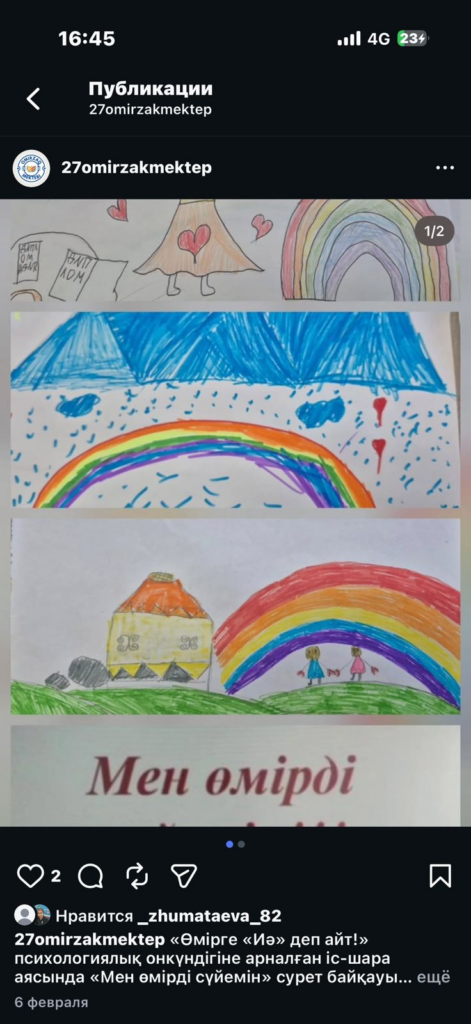 «Өмірге «Иә» деп айт!» психологиялық онкүндігіне арналған іс-шара аясында «Мен өмірді сүйемін» сурет байқауы өткізілді. Мақсаты: Білім алушылардың өмірге деген оң көзқарасын қалыптастыру, өмірдің құндылығын түсіндіру, психологиялық қолдау көрсету арқылы эмоционалдық жай-күйін нығайту, шығармашылық қабілеттерін дамыту және салауатты өмір салтын насихаттау.