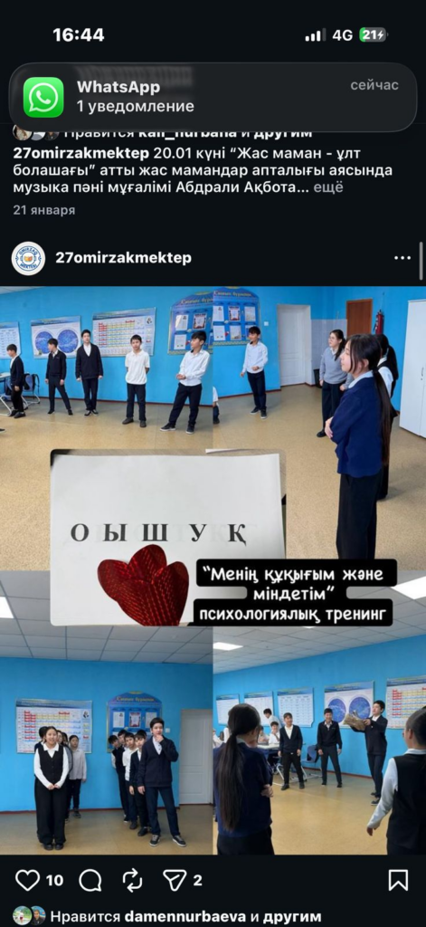 «Таза сана» жобасы аясында мектеп психологы 8-сынып оқушыларымен «Менің құқығым және міндетім» тақырыбында психологиялық-құқықтық бағыттағы тренинг өткізді. Тренингке 8-сынып білім алушылары толықтай қамтылды. Тренинг барысында оқушыларға ҚР-ның заңнамасына сәйкес кәмелетке толмағандардың негізгі құқықтары мен міндеттері туралы түсіндірме берілді. Қатысушылардың белсенділігін арттыру мақсатында сұрақ-жауап, пікір алмасу, жағдаяттық тапсырмалар және психологиялық жаттығулар ұйымдастырылды.