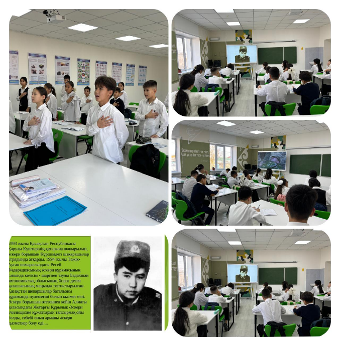 Мектебімізде 25.11.2024ж күні » Раджан Батырханов-шекарашы» атты бірыңғайсынып сағаты өтті. Мақсаты: Р.Батырханов өмірі мен жеткен жетістіктері арқылы оқушы бойына Отаншылдық, адамгершілік қасиеттерін дарыту. Раджан Батырханов- интерноционалист-жауынгер, батыр шекарашы.Болашақ өскелең ұрпақ үшін өз қаһармандарын тану маңызды.Ерлігін жасұрпаққа үлгі ету.