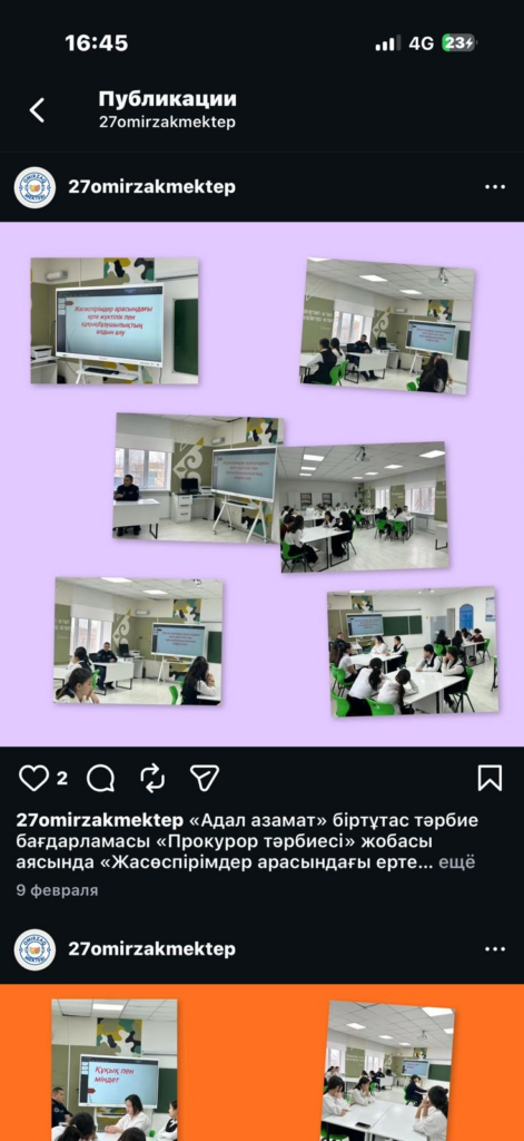 «Адал азамат» біртұтас тәрбие бағдарламасы «Прокурор тәрбиесі» жобасы аясында «Жасөспірімдер арасындағы ерте жүктілік пен құқық бұзушылықтың алдын алу» тақырыбында кездесу өткізілді. Мақсаты: Жасөспірімдер арасында құқықтық сауаттылықты арттыру, ерте жүктіліктің алдын алу, жауапты мінез-құлық мәдениетін қалыптастыру және құқық бұзушылықтың алдын алу бағытында түсіндіру жұмыстарын жүргізу.